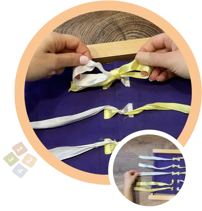 Упражнение напреднал етап (4-7 г.) Рамка за завързване и отвързване на панделки Връзване и отвързване на панделки, връзки и др.