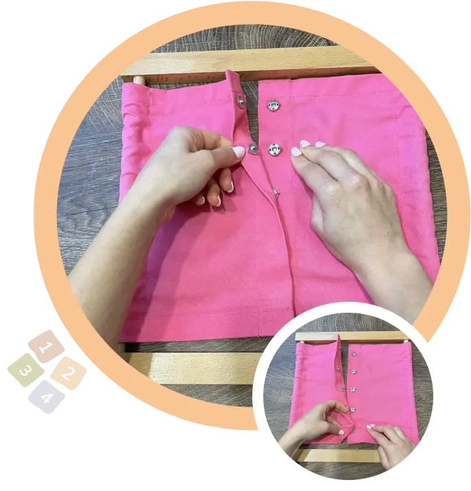 С лявата ръка повдигнете леко плата в долния край, за да покажете на детето къде е копчето. Придържайте с дясната ръка и притиснете внимателно копчето с лявата, докато се чуе “щракването”, за да закопчаете.